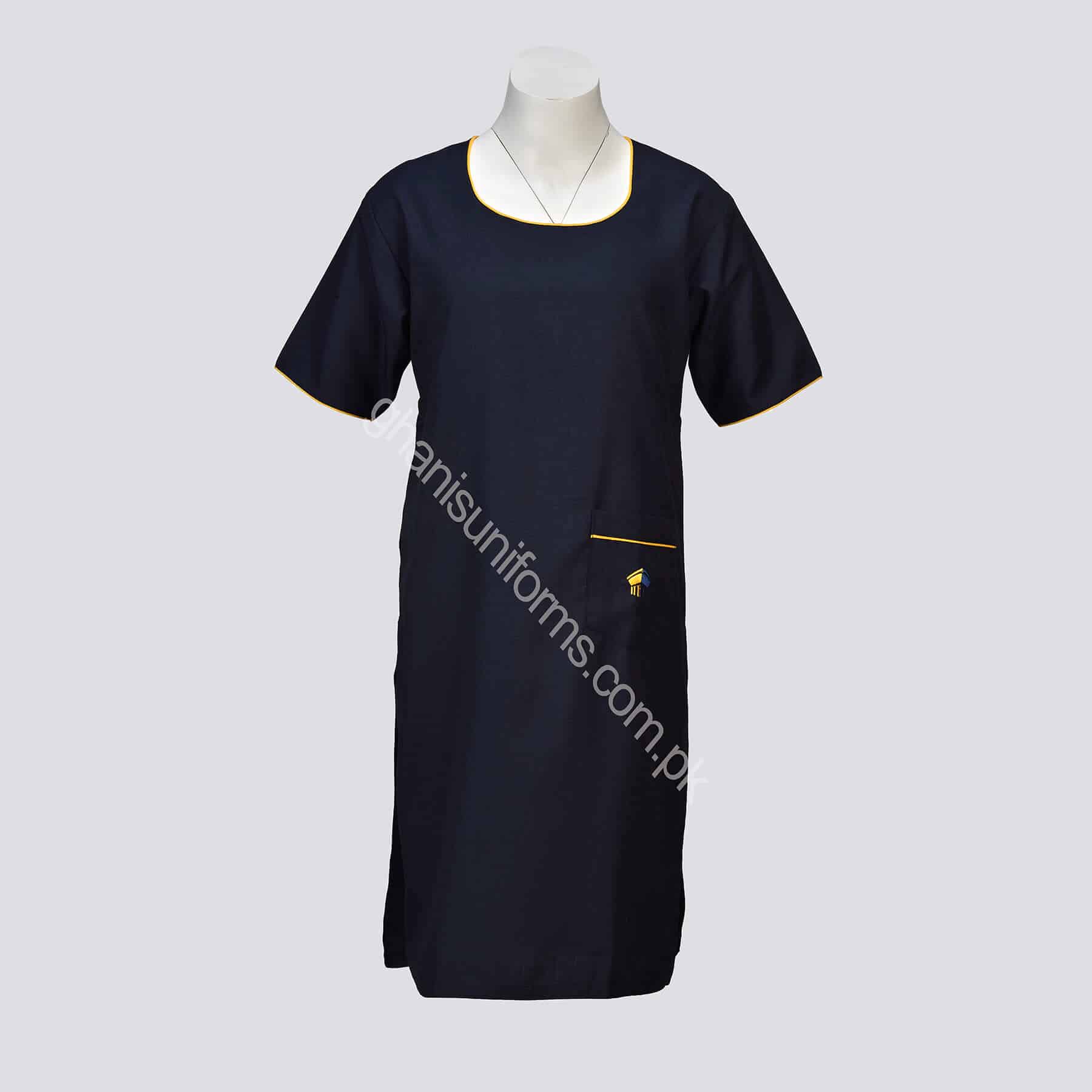 The classically styled short-sleeved Cedar School Uniform Shirt for Girls features a logo on the front pocket. Its attractive navy blue color is ideal for students, as it looks wonderful. The sleeves and neck border are in yellow. Purchase your desired size online from our website now.